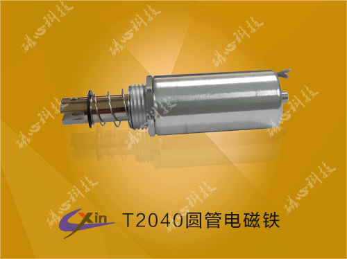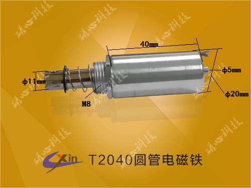 T2040圓管電磁鐵直徑20mm,高度40mm,采用圓管式結構,產品可以在節省空間的情況下產生較大的推拉力,磁心科技批量生產圓管式電磁鐵T2040,具體介紹如下: